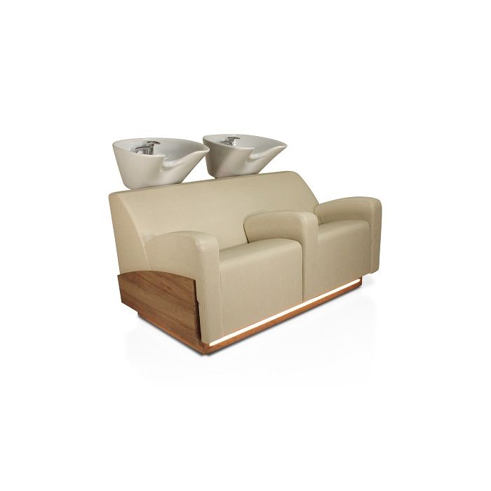 The unique sofa design of the backwash chair features a mix of upholstered and laminated sections, which you can choose out of our large range, in any combo you like. The unit also features a mood stimulating LED light and two ceramic basins, which include the taps. Available in any laminate and fabric combo LED feature plinth lighting White tilting Kiko ceramic basin for exceptional comfort Monoblock mixing valve with chrome hand spray, pre-plumbing, flexi waste and fixing kit Large basin hair trap
